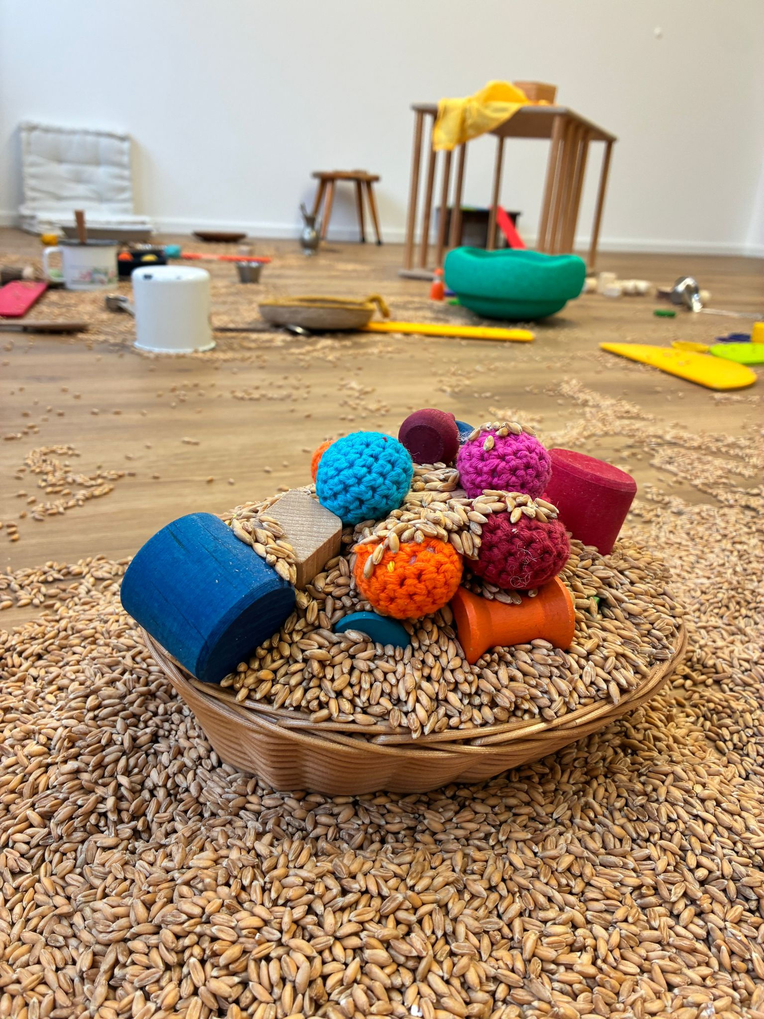 Die Kinder folgen in einer vorbereiteten Umgebung mit altersgemäßen Materialien spontan ihren Bewegungsimpulsen und sammeln sensorische, motorische und soziale Erfahrungen.